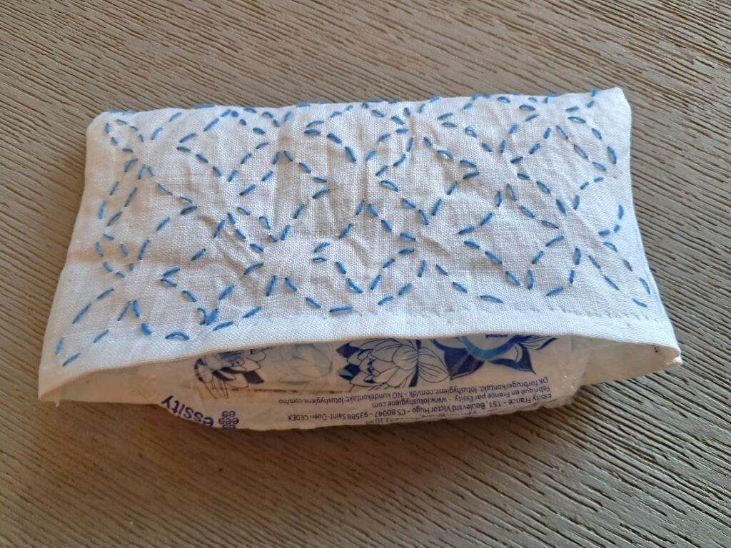 Aujourd’hui le Sashiko est apprécié pour son esthétique et son coté méditatif. Il est souvent réalisé avec des motifs géométriques simples. Cette technique reflète des valeurs culturelles telles que le mottainai (ne pas gaspiller) et le wabi-sabi (beauté de l’imperfection)