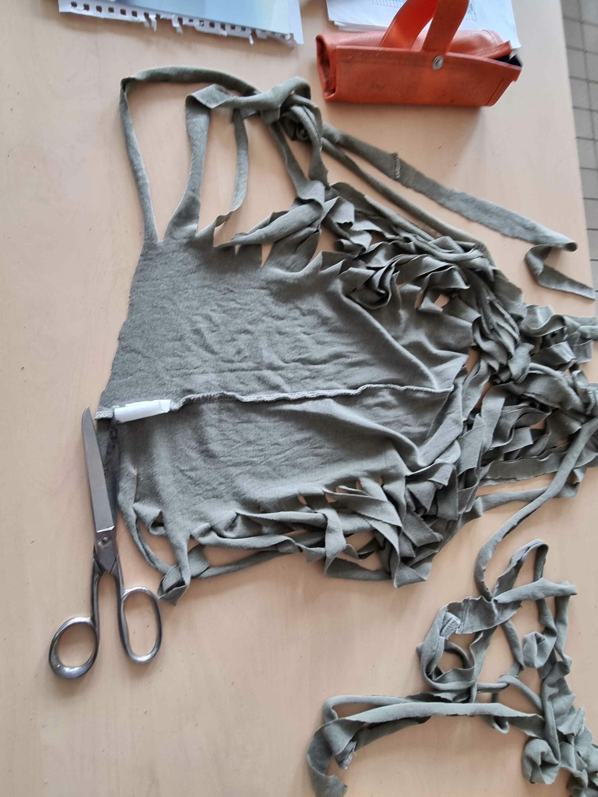 Deuxième variante : à partir de vieux Tshirts , on découpe astucieusement le tissus pour obtenir un ruban continu et on le tresse ensuite sur la matrice .
