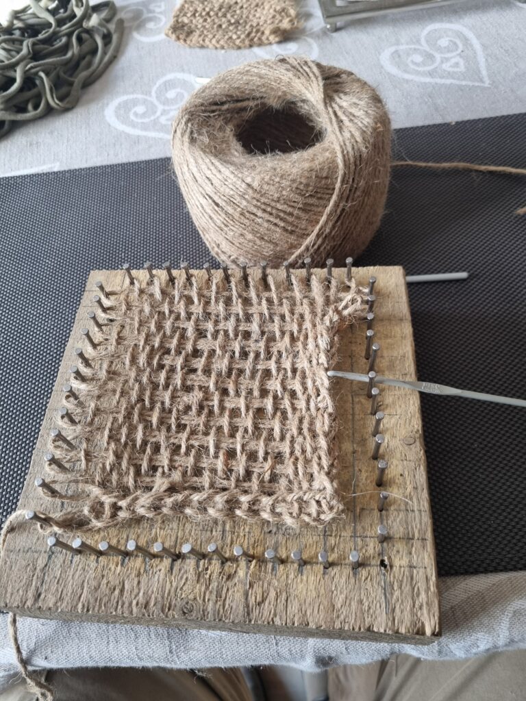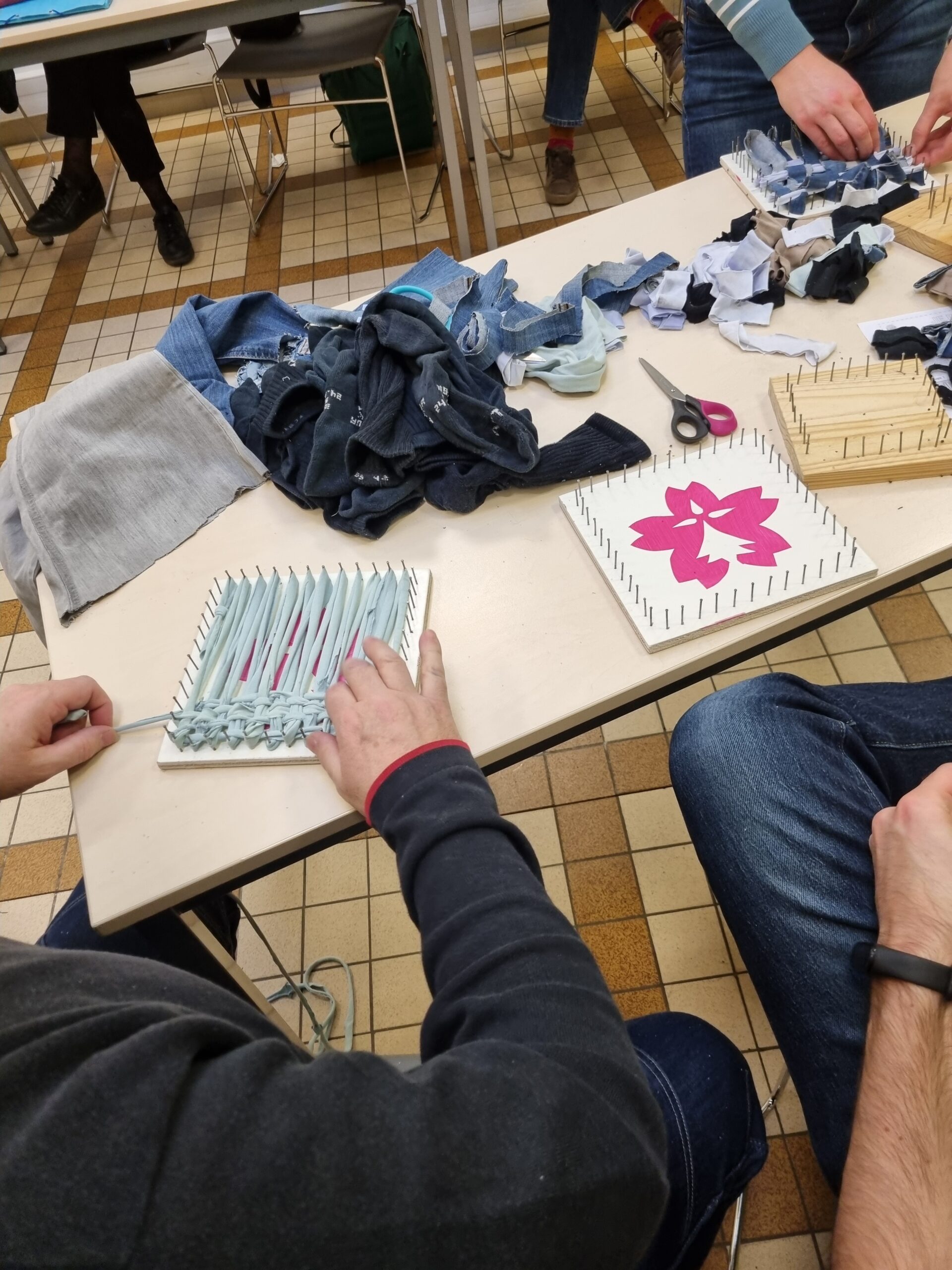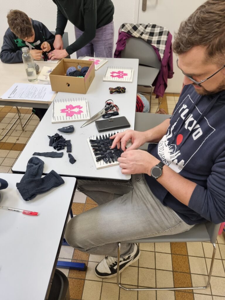 Première variante : à partir de vieilles chaussettes, on découpe des anneaux que l’on peut tresser directement sur les matrices à clous.